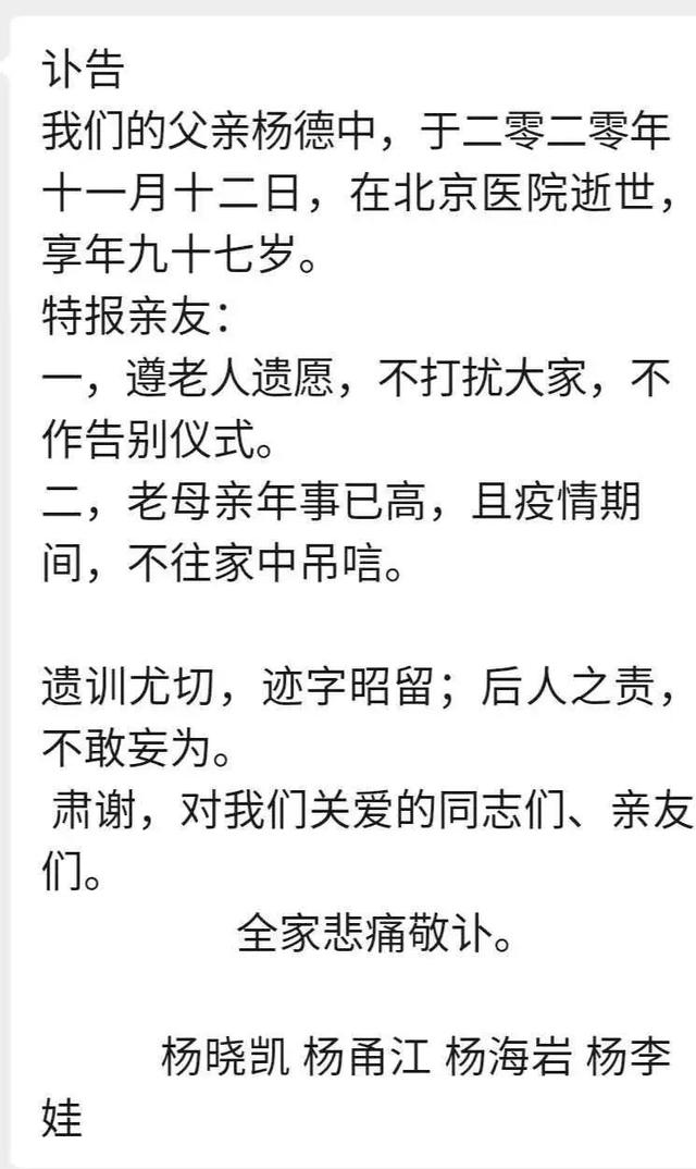 刚刚从中央警卫局原局长杨德中上将的亲友朋友圈得知:杨德中上将于2020年11月12日,在北京医院逝世,享年九十七岁。